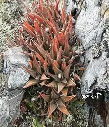 Phylogenetic studies, particularly from 2010 onwards, showed that Haworthia and other genera related to Aloe were not monophyletic.[7][8] Accordingly, in 2013, Rowley separated most of the species formerly placed in Haworthia subg. Hexangulares into a new genus, Haworthiopsis.[9] Haworthiopsis was revised in 2013 by Manning et al. so that the genus more closely correlated with the former subgenus,[3] a revision described as "more coherent" by Gildenhuys and Klopper in 2016.[4]