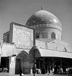 The main big dome, which rests on eight windows that make a cupola, is covered with arabesque motifs and inscriptions decorated using Kashi blue tiles. Inside the building's main cupola is a band of calligraphy under the windows. The minaret of the mosque is covered in kashi tiles and its basin rests on three bands of muqarnas with a blue ribbed dome topping the minaret.[21] Under the big dome in the summer chapel, there's a mihrab made of colored bricks, and on either side of it are panels with pointed arches and writings in square Kufic script. There are also inscriptions that date the construction of the mosque.[22]