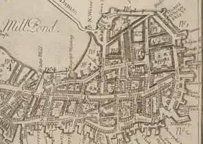 The mouth of Mill Cove was dammed in the 1640s, turning it into Mill Pond.[2]: 74 Several mills and rum distilleries, powered by tidal water flows, were built on the shores of the pond.[3]