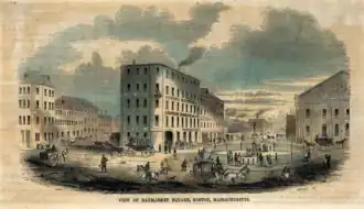 From its opening in 1845 to its demolition in 1897, the most prominent building on the square was the Boston and Maine Railroad depot.[17] According to an 1892 guidebook, "The Boston and Maine Railroad, alone of all lines entering the city on the north side, enjoys the privilege of penetrating within the outer street. Its station is in Haymarket Square, and the open space in front of it gives prominence to the structure."[18] The railroad provided service to Lowell, Portland, and Lake Winnipesaukee.[19]: 139