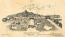 Maps from as early as 1814 show a market at the intersection of Merrimack, Canal, and Charlestown Streets.[2]: 87 The name "Haymarket Square" appears on an 1844 map.[9] No earlier map on the City of Boston atlas includes the name.[10] A drawing published in 1895[11] entitled "View of the New Land in 1828" also shows the name "Haymarket Square". The name was applied because the square was "the site of one of several public scales used for weighing and selling hay."[12] Images from the mid-1800s show hay being sold in the square.[13] The Haymarket Pushcart Association,[14][15] which traces its history to 1820, still operates the Haymarket market a block away.[16]