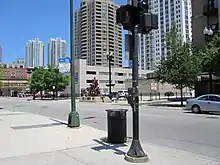Haymarket Square[1] is a commercial area on the Near West Side[2] of Chicago at Randolph Street and Des Plaines Street[3] just east of Halsted Street,[4] known primarily for the protest and bombing that occurred on May 4, 1886.[5][6] It was a wide,[7] busy commercial food produce market[8][9] for much of the 19th and early 20th centuries. The square is a tourist destination,[10] and is often a rally point for various unions[11] and political groups and individuals.[12]