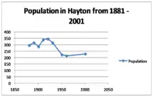 In the 2011 census the Office for National Statistics (ONS) identified a "Hayton (Allerdale) Built-up area", corresponding to the village, with a population of 237 in 94 households.[4] This figure was also the population recorded for the whole parish of Hayton and Mealo,[5] confirming that the village is the only settlement in the parish. The built-up area was calculated to be 0.081 square miles (0.21 km2),[4] while the area of the parish is 2.919 square miles (7.559 km2).[5] The ONS identifies built-up areas algorithmically.[6]
