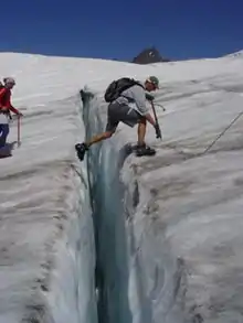 When travelling over glaciers, crevasses pose a grave danger.[8] These giant cracks in the ice are not always visible, as snow can be blown and freeze over the top to make a snowbridge. At times snowbridges can be as thin as a few inches. Climbers and hikers use ropes to protect themselves from such hazards. Basic gear for glacier travel includes crampons and ice axes, and teams of two to five tie into a rope equally spaced. If someone begins to fall the other members of the team perform a self-arrest to stop the fall and then attempt a rescue.