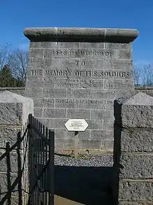 During the summer of 1863, while the Union Army of the Cumberland outmaneuvered Bragg's Confederates in the Tullahoma campaign, members of Hazen's Brigade were detailed back to Stones River to build a monument both to commemorate the heroism of the brigade and to memorialize their lost comrades.[5] A construction detail under Lt. Edward Crebbin placed the monument on private property in the middle of the brigade cemetery in Round Forest.[6] A Union army captain described the monument as a "quadrangular pyramidal shaft, ten feet square at the base and eleven feet in height....A dry-stacked stone wall, four feet high and two feet thick, enclosed both monument and cemetery. Three low steps breached the wall's south side to allow access."[7] In 1864 two experienced stone cutters from the regiment carved the inscriptions, including names of the regimental officers killed at Stones River and the earlier Battle of Shiloh. On the south face the stone cutters inscribed the words, HAZEN'S BRIGADE/ TO THE MEMORY OF ITS SOLDIERS WHO FELL AT STONES RIVER, DEC. 31ST 1862/ THEIR FACES TOWARDS HEAVEN, THEIR FEET TO THE FOE.[8]