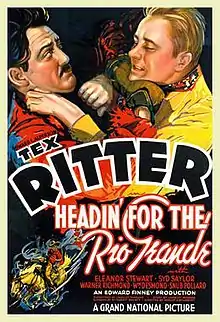 Headin' for the Rio Grande is a 1936 American Western film directed by Robert North Bradbury and written by Robert Emmett Tansey. The film stars Tex Ritter, Eleanor Stewart, Syd Saylor, Warner Richmond, Charles King, Earl Dwire, Forrest Taylor, William Desmond and Snub Pollard. The film was released on December 20, 1936, by Grand National Films Inc.[1][2][3]