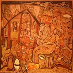 Twins Seven Seven was intimately familiar with the ritual he depicted, being the sole surviving child of seven sets of twins. The Yoruba are both blessed with an unusually high incidence of twins and cursed with high infant mortality, a fact which they explain with the concept of abiku, or children born to die shortly thereafter. To end the cycle, mothers consult special divination priests, who use ceremonies and medicines to convince the children to remain in the community. The predominant figure in this work is such a mother, who holds one of her abiku twins while the other sleeps on her back. To the left, the priest framed by the door mixes the potions he will use on the children.[2] Every inch of space is filled by people busily performing various tasks, their large eyes and facial scarification matching traditional Yoruba ideals of beauty. Twins Seven Seven's unique combination of modern and traditional styles (he was trained by German artists in Nigeria) is on display in this work, with its intricate, rhythmic designs from edge to edge and an almost sculptural quality due to the combination of carving and coloring the wood.[3]
