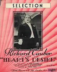 Heart's Desire is a 1935 British musical drama film directed by Paul L. Stein and starring Richard Tauber, Leonora Corbett, Kathleen Kelly, Diana Napier and Frank Vosper.[1] Its plot involves a young opera singer who is discovered in Vienna and brought to London where he rises to stardom.[2] The film was made at Elstree Studios in April/May 1935, and had its charity premiere at the Regal Cinema, Marble Arch, London on 17 October that year. It was part of a cycle of British operetta films.