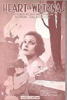 Heart of Wetona is a World War I era song released in 1919 by Leo Feist, Inc. of New York, New York. Sidney D. Mitchell wrote the lyrics. Archie Gottler composed the music. Rosenbaum Studios provided the cover art. On the cover is a soldier embracing a Native American woman. In the background is a Native American on horseback, holding a spear above his head. Featured in the center is a picture of American silent film actress, Norma Talmadge, who starred in the film The Heart of Wetona (1919), whom the song is dedicated to.[1] The song was written for both voice and piano.[2]