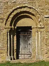 The chapel is Norman in style.[3] It is constructed in grey siltstone rubble with yellowish sandstone ashlar dressings. It has a rectangular plan, and consists of a two-bay nave with a south doorway and a two-bay chancel.[4] There is no bellcote. The chapel is supported by full-height buttresses, and there is a string course around it at mid-height. The windows are small. The doorway has two orders of shafts with decayed capitals. It is decorated with chevrons, but has a plain tympanum.[3]