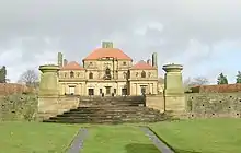The house is built of local ashlar: yellow Guiseley stone decorated with grey stone from Morley,[10] with rustication on the ground floor and on the tall chimneys. The main features of the house and gardens are symmetrical around a north-south axis.[2] English Heritage have identified a compositional influence from the 17th-century French architect François Mansart.[4] The house has a three-storey central block, set back between two flanking two-storey pavilions to east and west, each with an additional one-storey outer wing. Each of these five components has a hip roof,[4] made of red pantiles.[10]