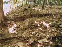 Archeological findings with cut through the wall surrounding the Roman camp