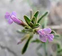 Hedeoma drummondii is a species of flowering plant in the mint family known by the common name Drummond's false pennyroyal. It is native to western North America, where it is distributed mainly in the United States west of the Mississippi River and adjacent Mexico. This is a hairy perennial herb with an erect mintlike form up to 45 centimeters tall. The oppositely arranged paired leaves are linear to narrowly oval in shape, pointed, and up to about a centimeter long. The leaves have a strong sweet mint scent when crushed.[1] The herb tastes like peppermint and is used as a minty flavoring in parts of Mexico.[2] The inflorescence arises from the axils of these leaf pairs, bearing three to seven flowers each between one and two centimeters in length on short pedicels. The flowers are generally light to deep lavender with some white markings. The fruit is a waxy, mucilaginous nutlet.