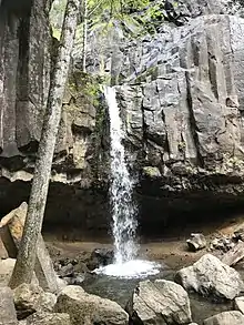 Hedge Creek Falls is located on the southernmost tip of a pre-Pleistocene lava flow from Mount Shasta. Thousands of years of erosion, mostly from the freezing and thawing of water trapped in cracks on the basaltic face, has resulted in the sheared appearance at the face of the falls. The cave behind the falls is a normal occurrence in thick lava flows and not the result of splashing water. The water in Hedge Creek Falls comes from the massive aquifer resultant of several volcanic occurrences and not from the glaciers found on Mt. Shasta. Although small, Hedge Creek Falls is full of beauty and awe. Its single crest, or lip, is reminiscent of its larger sister, Bridalveil Fall, in Yosemite.[4]