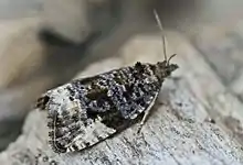 The wingspan is 15–19 mm.The forewings are white, sometimes partly ochreous-tinged, more or less strigulated posteriorly with dark fuscous. The basal patch, central fascia, and included space are dark brown mixed with dark ashy-fuscous and blackish, somewhat whitish-sprinkled, especially in the space on costa and fold.The posterior edge of the fascia has an angular prominence in middle, sometimes followed by one or two dark dots. There isa greyish subterminal streak and the extreme apex is blackish-fuscous. The hindwings are grey, darker in the female . The larva is bright green ; tubercular spots, head, and plate of 2 black.[1]