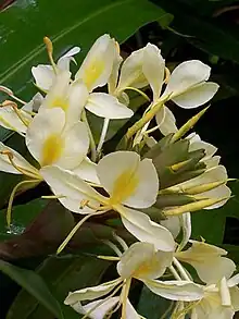 Commonly known as cream garland-lily[3] or yellow ginger, it grows up to 2.5 metres (8 ft 2 in) high. It is extremely shade-tolerant, and thrives in a wide range of soils. Since it has the ability to regrow from even a small fragment of the rhizome, which survive crushing, immersion in sea water, and even years outside of soil, elimination can be a problem. It is treated as an invasive weed in New Zealand because of its ability to displace other species.