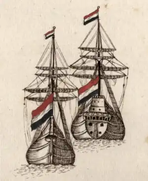 ![]() Stern view of Heemskerck, right, and Zeehaen, as sketched in Abel Tasman's journal | |