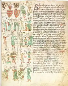The Heerschild (German: [ˈheːɐ̯ˌʃɪlt]; Latin: clipeus militaris[1]), also called the shield of knighthood,[2] in the Early Middle Ages was the right to raise a feudal levy of troops. The call to do so was the Heerbann. The resulting importance of a system of military ranks, based on the ability to provide men for a campaign, became modified in the law books published in the 13th century. It finally ended up as being an important part of the structure of medieval society, as captured in the feudal law element of the Sachsenspiegel by Eike von Repgow.
