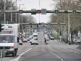 Heerstraße (German pronunciation: [ˈheːɐ̯ˌʃtʁaːsə] ; literally: Army Street) runs from Theodor-Heuss-Platz in Berlin-Charlottenburg to the western city border of Berlin in the locality of Staaken in the borough of Spandau. It is part of Bundesstraße 5; from Theodor-Heuss-Platz to Wilhelmstraße it is forms part of Bundesstraße 2. With a length of around 10 kilometres, it is one of the longest streets in Berlin and an important commuter route. The street is a five-lane expressway (Kraftfahrstraße), depending on traffic flow the middle lane is available during rush hours in the morning (eastbound) and in the evening (westbound).