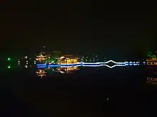 Hehuachi is part of Yangzhou's intricate network of lakes and canals. The Erdaohe (二道河) Canal, running along the western edge of Yangzhou's old city, comes to the Hehua Pond from the north, connecting it with the Thin West Lake at the city's northwest. The short (300-meter long) Erdaogou (二道沟) Canal runs east from the Hehua Pond, linking it with the nearby old channel of the Grand Canal of China, which forms the old city's southern and eastern borders.[2] It is possible to sail a small water craft from the Thin West Lake, via the Erdaohe, the Hehua Pond, and the Erdaogou into the Old Grand Canal.[3]