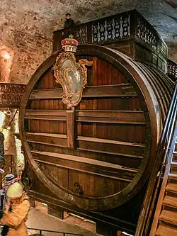 The Heidelberg Tun (German: Großes Fass), or Great Heidelberg Tun, is an extremely large wine vat contained within the cellars of Heidelberg Castle. There have been four such barrels in the history of Heidelberg. In 1751, the year of its construction, the present one had a capacity of 221,726 litres (58,574 U.S. gallons). Due to the drying of the wood its current capacity is 219,000 litres (57,854 U.S. gallons). One hundred and thirty oak trees were reputedly used in its construction. It has only rarely been used as a wine barrel, and in fact presently enjoys more use as a tourist attraction, and also as a dance floor since one was constructed on top of the tun.