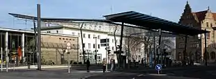 In the autumn of 1958, a new roof was built above the bus station in front of the station, which was designed by Heinrich Röhm. It was 20 m long and 3.40 m wide and has been described as a "sleek airplane-like structure". It rested on five pillars.[7] The roof was replaced by a suspended honeycomb structure in 1980.