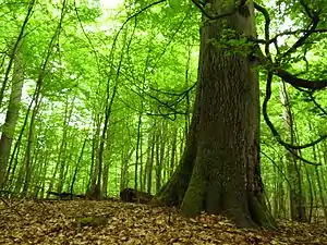 The Heilige Hallen ("Holy Halls") are one of the oldest beech woods in Germany and are found in the district of Mecklenburgische Seenplatte in Mecklenburg, 3.5 kilometres west of Feldberg. In the mid 19th century, Grand Duke George of Strelitz, impressed by the giant, columnar trees, ordered that this woodland should be protected and looked after for all time. The 25 hectare core area of the forest has been a nature reserve since the 24 February 1938. Because several of the already 350-year-old, up-to-53-metre-high trees have exceeded their natural life span, the wood today has a large amount of dead wood. In 1993 the area of the reserve was increased from 25 to 65.5 hectares.
