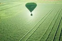 Heiligenschein, or hotspot, around the shadow of a hot-air balloon cast on a field of standing crops (Oxfordshire, England)