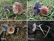 The mushrooms have a woolly veil and blue/grey gills and the flesh reddens when injured.[3]