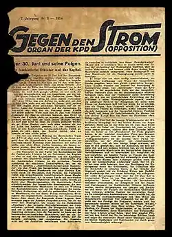 Brandler and Thalheimer gathered their supporters into a new organization called the Communist Party of Germany (Opposition) (KPO), a group which was founded at the December 30, 1928, meeting which had originally prompted the wave of expulsions. The group also launched a new communist opposition journal, Gegen den Strom (Against the Current).[4]