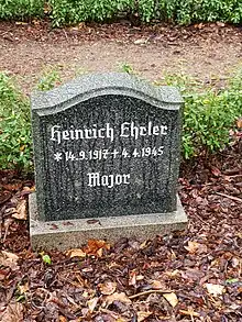 On 4 April, RAF Bomber Command targeted Nordhausen with 243 Lancaster bombers while the USAAF Eighth Air Force sent 950 B-17s and B-24s to Luftwaffe airfields at Kaltenkirchen, Parchim, Perleberg, Wesendorf, Faßberg, Hoya, Dedelstorf and Eggebek, as well as the U-boat yards at Finkenwerder and shipyards at Kiel. This bomber force was protected by 800 escort fighters.[69] In the Forsyth account, Ehrler claimed his final two aerial victories on this date.[66] On 6 April, the Eighth Air Force attacked Halle, Leipzig and Gera with a force of 641 heavy bombers, escorted by 600 P-51s and Republic P-47 Thunderbolt fighters. According to Boehme, Ehrler claimed two B-17s shot down from this attack force before being killed.[70] Alternatively, both authors report that Ehrler may have died while ramming an enemy bomber. According to Ehrler's final received transmission, he radioed "Theo, I've just used all my ammunition. I'm going to ram. Good bye. See you in Valhalla."[57][66] Schuck who followed the radio transmission exchange over the loudspeaker in the operations room recalls Ehrler's last words slightly differently. He believes they were: "Theo, Heinrich here. Have just shot down two bombers. No more ammunition. I'm going to ram. Auf Wiedersehen, see you in Valhalla!"[71][72]