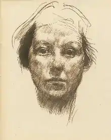 Imprisoned a few days before Helen Spanton was her suffragette friend and relative Katie Edith Gliddon, who had also been a student at The Slade (from 1902), and was arrested for breaking a Post Office window. Katie Gliddon had sewn pencils into her coat and kept a clandestine diary and sketchbook. She made an important record of the life of suffragettes in prison.[15] These diaries were dedicated "'To the memory of Helen Margaret Spanton. Born at Bury St Edmunds. Died at Blackheath".[16] Katie Gliddon was the model for In an Alcove (1902). Helen Spanton and Katie Gliddon were both related to members of the Hardy family that included numerous artists, amateur and professional.[17]