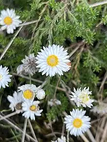 Helichrysum calvertianum is a small, many branched subshrub to 30 cm (12 in) high with smooth stems and occasional woolly, small glandular hairs. The green crowded leaves are sticky, linear, 3–8 mm (0.12–0.31 in) long, 0.5–0.8 mm (0.020–0.031 in) wide, margins rolled under concealing the lower surface. The papery white, daisy-like flowers are borne singly at the end of wiry branches, 0.7–1 cm (0.28–0.39 in) long and 1–1.5 cm (0.39–0.59 in) in diameter with yellow centres. The bracts are scaly, brownish, somewhat hairy near the base, intermediate bracts longer with pale, papery edges, sometimes tinted pink near the apex, outer bracts golden and translucent, innermost bracts narrow with small, papery white edges. Flowering occurs from January to August and the fruit are a dry, one-seeded, slightly glandular, oblong to needle-shaped, bristly and almost feathery at the tip.[2][3][4]