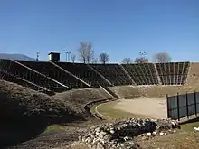 Unique to Hellenistic theatres was the type of seats of the auditorium, the theatron; The semicircular rows of seats were covered with 50 by 50 by 7 centimeters of mud bricks, the seats were a half brick width high. Before the beginning of the Roman period, the seats were covered with marble. The current form of the theater is the result of a modern reconstruction on the antique foundations.[2] The seats in the spectator area are now covered with wooden boards.