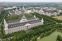 The campus is at the center of Zhengzhou, covering approximately 144000 m2. The design is made of themed parks on each side of campus. The design makes use of the drainage system and the natural environment.