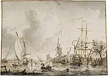 He came from a painting family and was a cousin of Ferdinand Kobell and Franz Kobell, German painters and brothers.[1] His father was a pottery merchant, and though he was not a professional artist, he trained his son in drawing, who loved to draw ships in the port of Rotterdam. The younger Kobell was finally able to take a journey in one when his father arranged some business he could attend to in London in 1779. There he conducted his business while drawing all sorts of ships and boats, and when he returned to the Northern Netherlands in 1770, he gave up the pottery business to study art in Amsterdam.[1] He studied for two years under Jacob de Vos and Cornelis Ploos van Amstel with such success that he was elected a member of the Stadstekenacademie (Amsterdam drawing academy).[1] He travelled to Paris in 1772 and in 1772 settled in Rotterdam, where he helped set up a similar drawing academy; Genootschap Hierdoor tot Hooger.[1]