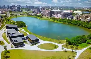 The Hengshan Calligraphy Art Museum is a two-story building with a floor area of about 3,000 m2 (32,000 sq ft). It is the first official art museum in Taiwan with the theme of calligraphy. The architect is Tianyi Pan. The design of the pavilion area is based on the imagery of the park as the inkstone and the pond as the inkwell. The exterior of the building is in the form of seals, consisting of five square boxes from left to right.[3][4][5]
