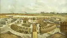 In order to guarantee effective protection, a number of forts distributed around the city's perimeter were required. Using new materials, many of these newer fortifications were built of concrete and incorporated retractable gun cupolas, often based along triangular or trapezoid plans.[9] Because of the need to use specialist workers, the construction process was slow and expensive.[10] He was also an early supporter of using wire entanglements for defensive purposes.[11] In an 1879 pamphlet, he advocated the use of wire barricades against infantry assaults.[11]