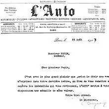 Dear Mr Pépin, it is with great pleasure that, according to the desire you expressed in your last letter, instead of sending you cash for the allowances owed to you, L'Auto will provide you with a medal to the same value.[11]