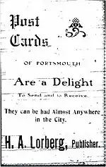 Lorberg worked as a reporter for the Portsmouth Times and other local newspapers, for many years.[3] Lorberg wrote and published several books of local history, including "Recollections of 50 Years", "The Centennial Souvenir of Portsmouth", "Portsmouth Past and Present", etc. These books contained many photographs and stories of Portsmouth's early history.[4] Lorberg's 136-page, 1908 book, "Pictorial Portsmouth, the Peerless City, Past and Present", was well received. The reviewer called it "the finest thing of its kind the Times has ever seen...The portraits include most of the people who have ever been prominent in Portsmouth, many of whom are dead, many being still alive and among our active citizens."[5]