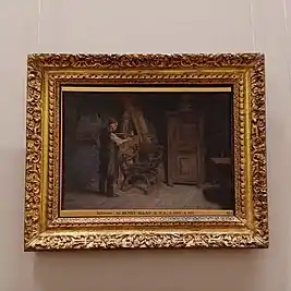 At the Académie, Allan initiated his studies in the antiquity course. He was soon after given the fifth prize for drawing from a figure in May of 1885. Following that, he studied under Karel Verlat in the life class, where in 1887 he came in fourth for a painting based on a model.[4] While many of the Irish artists in Antwerp later settled in France to paint, Allan travelled back to his home country, Ireland, in 1888.[3] Allan was inspired by the work of artists affiliated with the Hague school, like Jozef Israels, as was the case with many Irish students at Antwerp, and this element of nostalgia may be detected in Allan's painting ‘A Dutch interior’.[4] He began to display his paintings at the Royal Hibernian Academy in 1889, and kept sending artwork to the Gallery's yearly exhibition until 1912, having a grand total of 113 works displayed. In 1893, his painting "Little Matchseller" earned him the Albert prize,[3] leading, eventually, to his being elected as an associate member of the Royal Hibernian Academy on the 18 of April 1895.[4] His notably most expensive painting at £250 was exhibited in 1898, called “Martial Law - An Episode of the Irish Rebellion in 1798”, after which the Royal Hibernian Academy saw “The Holy Women and St John with the Body of our Lord”,[3] resulting in him becoming a full member of the Royal Hibernian Academy on the 18th January 1901. He went on to serve as treasurer from 1909 to 1911. His works were also displayed at the Cork International Exhibition in 1902 and the Irish International Exhibition in Dublin in 1907, intertwining with his feature in two exhibitions of Irish art in London: The Guildhall exhibition of Irish paintings in 1904, and the Whitechapel exhibition of Irish art in 1913.[4]