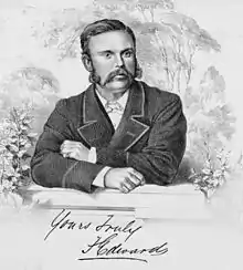 Henry Edwards was born to Hannah and Thomas Edwards (c. 1794–1857) at Brook House in Ross-on-Wye, Herefordshire, England, on 27 August 1827, and was christened on 14 September.[5] From his older brother William, he picked up an interest in examining insects. He collected butterflies as a hobby, and studied them under the tutelage of Edward Doubleday. His solicitor father intended a law career for his son, but after a brief period of unsuccessful study, Edwards took a position at a counting house in London, and began acting in amateur theatre. He then journeyed to join his brother William who had settled in Australia, nine miles (14 km) north-west of Melbourne along the bank of Merri Creek, a location then called Merrivale. Aboard the sailing ship Ganges from March to June 1853, he wrote descriptions of creatures such as the albatross that he encountered for the first time.[5] After arriving in Melbourne, Edwards began collecting and cataloguing the insects he found on his brother's land, and further afield. Within two years, he had gathered 1,676 species of insects, shot and mounted 200 birds, and pressed some 200 botanical specimens.[5] This collection and that of William Kershaw were purchased by Frederick McCoy to form the nucleus of the new National Museum of Victoria.[5]