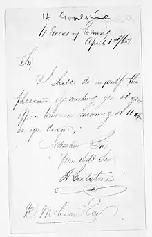 On 1 April 1863, Goulstone sent a note to Donald McLean, confirming an appointment with him for the following day.[9] Unfortunately no account of the meeting has been uncovered, so it is presently a mystery as to why Goulstone went to see Sir Donald. The letter (at right), is currently the only surviving written document of him.