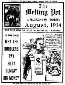 Under Tichenor's editorship, The Melting Pot established itself as a scathing forum especially for attacking organized religion. The magazine soon set its sights on Billy Sunday, perhaps the most prominent evangelist in America at the time and one particularly notable for his lavish lifestyle.[6] The front page of the August, 1914 issue of the Melting Pot featured a cartoon of Sunday, pockets bulging with money, again using a pulpit with a dollar sign, and preaching to a bloated character labeled “Big Biz.” In 2006, the Bank of Wisdom began selling a compact disc containing the first four years of The Melting Pot; issues published from 1913 to 1917.
