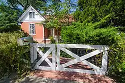 The house is a one-and-a-half-story brick building with modest Queen Anne elements. The house has a complex roofline, with a high Dutch gable over the main body of the house and smaller intersecting gables on both street-facing elevations. The lower gable ends are shingled and decorated with radiating spindles at each peak. The ground-floor windows are 1-over-1 wooden sash windows set in arched openings. The house also has shed-roofed front and rear porches with turned wooden posts.[5]