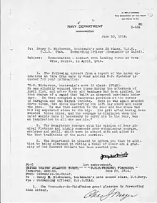 "H.N. Nickerson, boatswain's mate 2d class. (UTAH). He was slightly wounded three times during the afternoon of April 21st, and after first aid bandages had been applied, he took charge of a squad that built an advanced barricade under fire. He then occupied a dangerous position at the corner of Zaragoza and San Miguel Streets. Here he was again wounded three times, two shots shattering his left leg above and below the knee. He was then carried to the rear and has since had his leg amputated close to the hip. His grit after having been wounded three times, and the courage he displayed when his later wounds made it necessary to carry him to the rear, was an inspiration all who saw him."- The Department concurs with the opinion of Rear Admiral Fletcher and highly commends your conspicuous courage, coolness and skill, which were in accord with and added to the best traditions of the naval service.