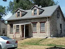 The house is constructed of limestone. Typical elements of Davenport's early homes that are found in this structure are the single story, side-gable roof, and the entrance on the long side of the house.[2] The only style elements of the house are found in its symmetry and the molded cornices above the windows and door.[3]