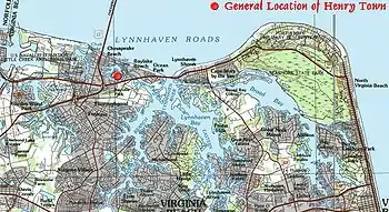 Henry Town, Henry Towne, or Henries Towne was an early English colonial settlement near Cape Henry, the southern point and gateway to the Chesapeake Bay in the Colony and Dominion of Virginia, now in modern Virginia Beach, Virginia, on the East Coast of the United States. Archaeologist Floyd Painter of the Norfolk Museum of Arts and Sciences (now the Chrysler Museum of Art) originally excavated the site in 1955, but it was only conclusively determined to be Henry Town in 2007 by United States Army scientists reviewing the site's artifacts, and no primary source documents exist (save those supposedly held by one now-deceased archaeologist). It was located east of Norfolk, Virginia and north of Chesapeake and south of the Hampton Roads harbor at approximately 36°54′30″N 76°7′20″W / 36.90833°N 76.12222°W / 36.90833; -76.12222. The historical and archeological site is immediately north of U.S. Route 60 (Shore Drive) on what is now Lake Joyce, formerly an inlet connecting with Pleasure House Creek, a western branch of the Lynnhaven River, itself an estuary of the Chesapeake Bay and Hampton Roads.