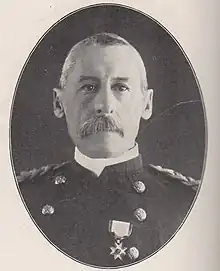 On August 16, 1892, he was promoted to major and would be the commander of the regiment during the Spanish–American War, commanding the regiment during the Battle of San Juan Hill but was wounded during the battle.[7] He was subsequently promoted to colonel on May 2, 1899, colonel of the 2nd Cavalry Regiment on February 1901. He briefly participated in the Philippine–American War but was discharged from service there due to poor health on February 2. He continued to remain in the United States Army and was promoted to brigadier general before retiring on April 23, 1904.[8] He died on November 9, 1929, and was buried at the Arlington National Cemetery along with his wife, Eliza Lane Wessells (née Meginnis).[3]