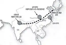 The legend of Heo is found in Garakguk-gi (the Record of Garak Kingdom) which is currently lost, but referenced within the Samguk Yusa.[8] According to the legend, Heo was a princess of the "Ayuta Kingdom". The extant records do not identify Ayuta except as a distant country. Written sources and popular culture often associate Ayuta with India but there are no records of the legend in India itself.[9] Byung-mo Kim, a professor and anthropologist at Hanyang University, linked Ayuta with Ayodhya in India based on phonetic similarity.[10] Grafton K. Mintz and Tae-hung Ha said it was an interesting note that Ayuta was the Ayutthaya Kingdom of Thailand, also due to phonetic similarities, "It is interesting to note that the city of Aythia was at one time the capital of the Kingdom of Thailand." but that they still backed an Indian origin by translating it as, "I am Princess of Ayuta (in India)".[11] However, according to George Cœdès, the kingdom of Ayutthaya was not founded until the year 1350, which was after the publication of Samguk Yusa.[11][12] Others theorize that the Ayuta Kingdom (Hangul: 아유타국, Hanja: 阿踰陁國) is a misinterpretation of the Ay Kingdom, a vassal to the Pandyan Empire of ancient Tamilakam as some sources allude to her coming from the southern part of India,[13] but a consensus is yet to be reached. Despite numerous theories and claims, Queen Heo's true origin is yet to be discovered.